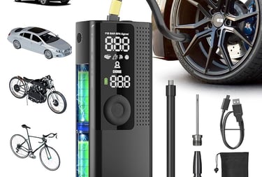The Airmoto Tire Inflator Portable Air Compressor - Air Pump For Car Tires with Digital Pressure Gauge, LED Light and Auto Shut-Off Function - Cordless Pump for Car, Motorcycle, Bicycle, Balls and More